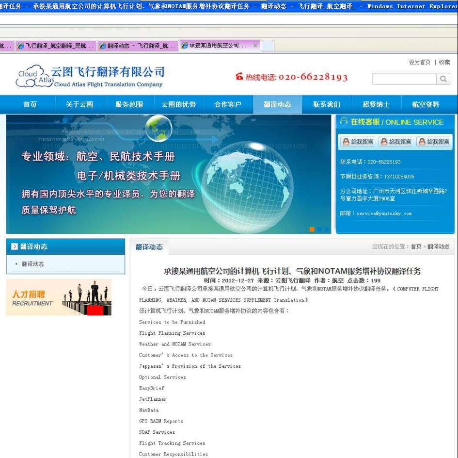 騙子公司云圖飛行翻譯大量復(fù)制藍(lán)天飛行翻譯公司的網(wǎng)站新聞,未注明來源,也沒有經(jīng)得藍(lán)天飛行翻譯公司同意,依靠仿站軟件大量復(fù)制到騙子公司云圖飛行翻譯網(wǎng)站內(nèi),舉例如下: