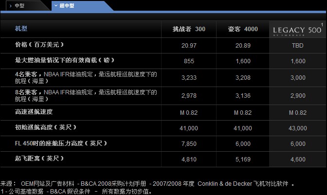 萊格賽500和挑戰(zhàn)者300以及豪客4000比較