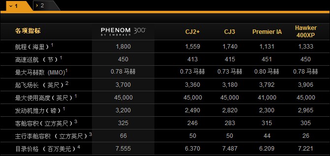 飛鴻300公務(wù)機(jī)最佳價(jià)值 1 - 按照2008年5月出版的公務(wù)/商用飛機(jī)采購(gòu)手冊(cè)的說(shuō)明,所有飛機(jī)的航程均是在攜帶了符合NBAA IFR 規(guī)定的飛往100海里備降場(chǎng)的備份燃油量,并且搭載4位乘客每位重200磅的基礎(chǔ)上給出的。最大使用馬赫數(shù)、高速巡航、行李艙容積、后行李艙以及最大使用高度等數(shù)據(jù)均來(lái)自相同的資料。 2 - 國(guó)際標(biāo)準(zhǔn)大氣、最大起飛重量、海平面。 3 - 基于2007/2008年度Conklin & de Decker飛機(jī)對(duì)比報(bào)告和競(jìng)爭(zhēng)者的公開(kāi)數(shù)據(jù)。 4 - 所有競(jìng)爭(zhēng)對(duì)手產(chǎn)品的價(jià)格均在2007/2008年度公務(wù)/商用飛機(jī)采購(gòu)手冊(cè)數(shù)據(jù)的基礎(chǔ)上給出。飛鴻300飛機(jī)2008年1月的價(jià)格等同于2005年1月685萬(wàn)美元的價(jià)格。