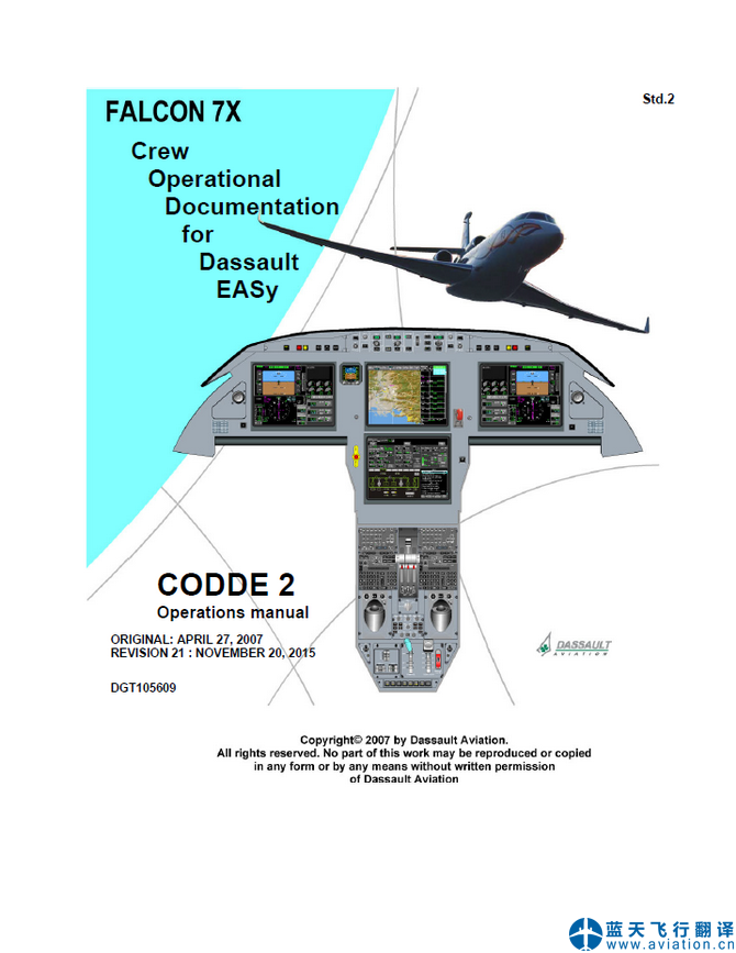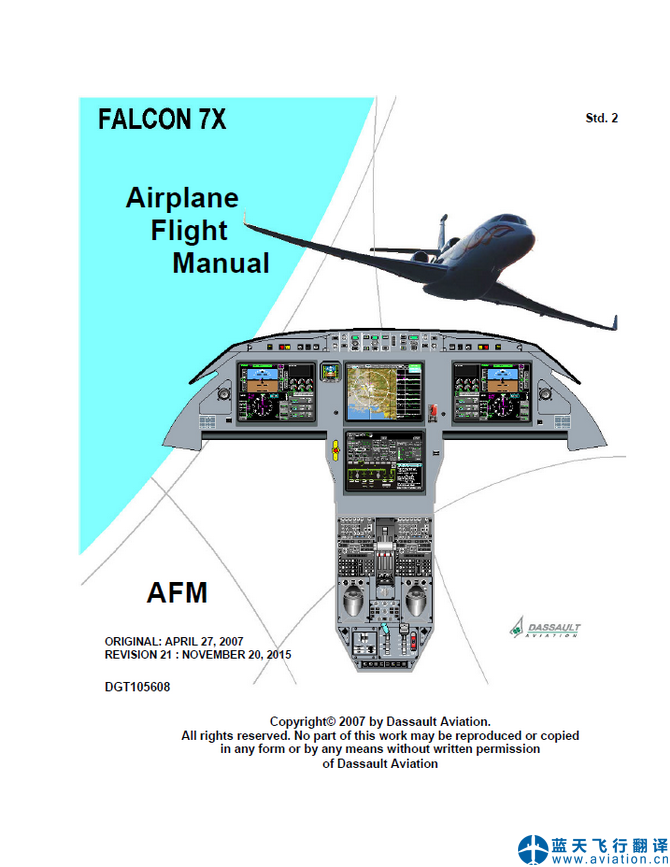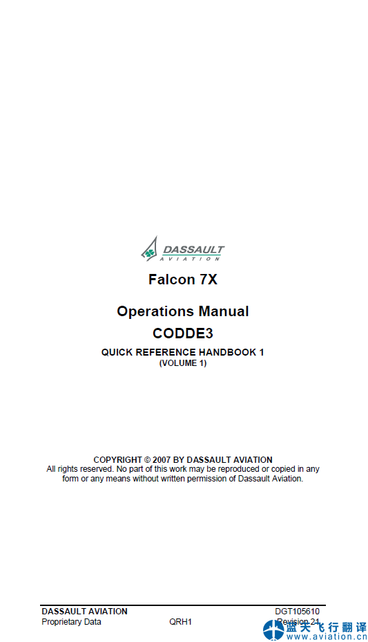 藍(lán)天飛行翻譯公司完成公務(wù)機(jī)公司的達(dá)索7X公務(wù)機(jī)飛機(jī)飛行手冊(cè)、機(jī)組操作手冊(cè)和快速檢查單等全套達(dá)索7X飛行手冊(cè)翻譯任務(wù) FALCON 7X AFM(Airplane Flight Manual), CODDE (Crew Operational Documentation for Dassault EASy) and QRH(QUICK REFERENCE HANDBOOK) Translation
