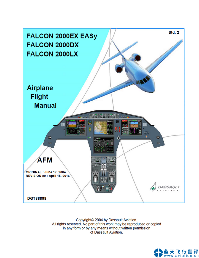 北京藍天飛行翻譯公司完成2016年4月15日版本達索獵鷹FALCON 2000飛行手冊翻譯 FALCON 2000 Flight Manual Translation CODDE(Crew Operational Documentation for Dassault EASy) REVISION 18 : April 15, 2016,機組使用手冊為第18版,2016年4月15日版本 QRH(Quick Reference Handbook) Revision 20 快速檢查單為第20版 AFM(Airplane Flight Manual) REVISION 20 : April 15, 2016 飛機飛行手冊為第20版,2016年4月15日版本 ![]() FALCON 2000 CODDE(Crew Operational Documentation for Dassault EASy) 達索獵鷹2000機組使用手冊 ![]() FALCON 2000 AFM(Airplane Flight Manual) 達索獵鷹2000飛機飛行手冊