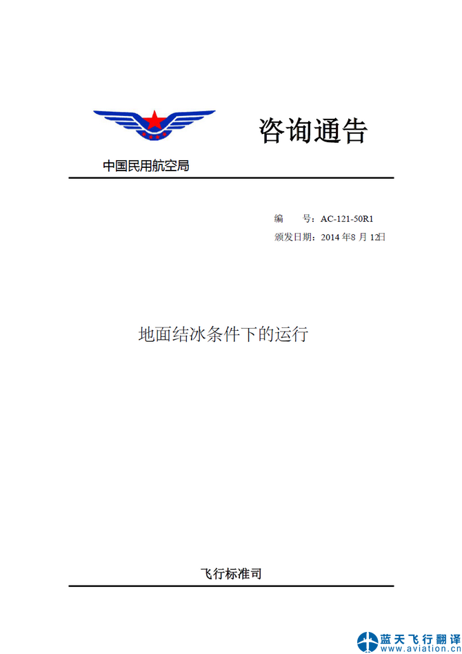 北京藍天飛行翻譯公司承接中國民用航空局飛行標準司地面結(jié)冰條件下的運行咨詢通告翻譯 CAAC Advisory Circular Translation: Ground Operation In Icing Conditions ![]() 地面結(jié)冰條件下的運行咨詢通告 地面結(jié)冰條件下的運行咨詢通告的內(nèi)容包含有: 中國民用航空局咨詢通告