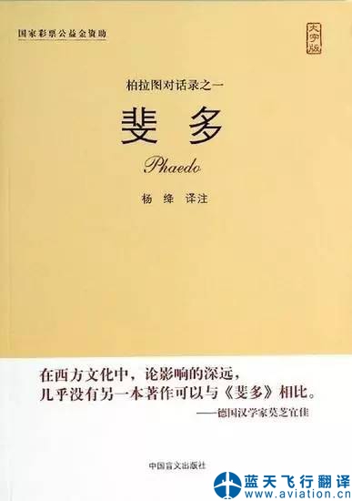 “我按照自己翻譯的習(xí)慣,一句句死盯著原文譯,力求通達(dá)流暢,盡量避免哲學(xué)術(shù)語,努力把這篇盛稱語言生動(dòng)如戲劇的對話譯成戲劇似的對話。柏拉圖的這篇絕妙好辭,我譯前已讀過多遍,蘇格拉底就義前的從容不懼,同門徒侃侃討論生死問題的情景,深深打動(dòng)了我,他那靈魂不滅的信念,對真、善、美、公正等道德觀念的追求,給我以孤單單生活下去的勇氣。” 2000年,中譯本《斐多》出版,被稱為“迄今為止最感人至深的哲學(xué)譯本”。 楊絳先生談翻譯