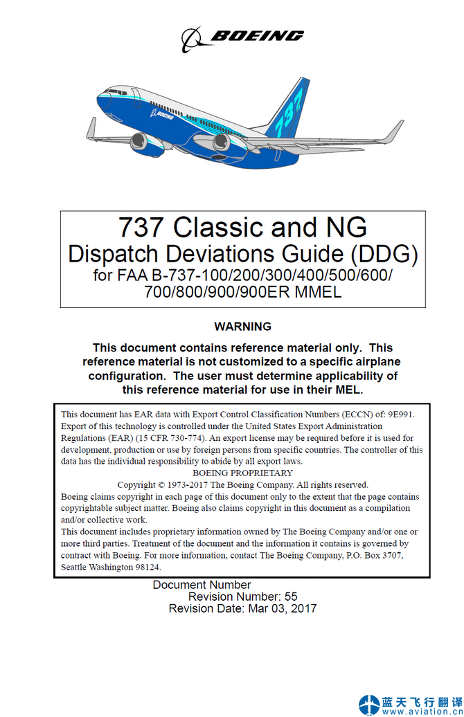 北京藍(lán)天飛行翻譯公司完成航空公司波音737放行偏離指南DDG翻譯任務(wù) Boeing 737 Classic and NG Dispatch Deviations Guide (DDG) Translation
