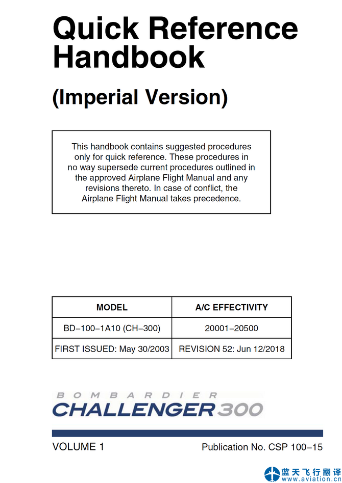 北京藍(lán)天飛行翻譯公司承接公務(wù)機(jī)公司2018年6月12日第52版龐巴迪挑戰(zhàn)者300公務(wù)機(jī)全套飛行手冊(cè)翻譯任務(wù) REVISION 52: Jun 12/2018 Bombardier Challenger 300 Flight Crew Operating Manual, Airplane Flight Manual and Quick Reference Handbook Translation