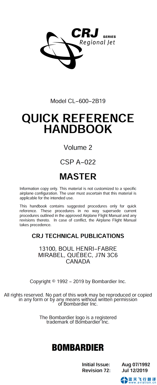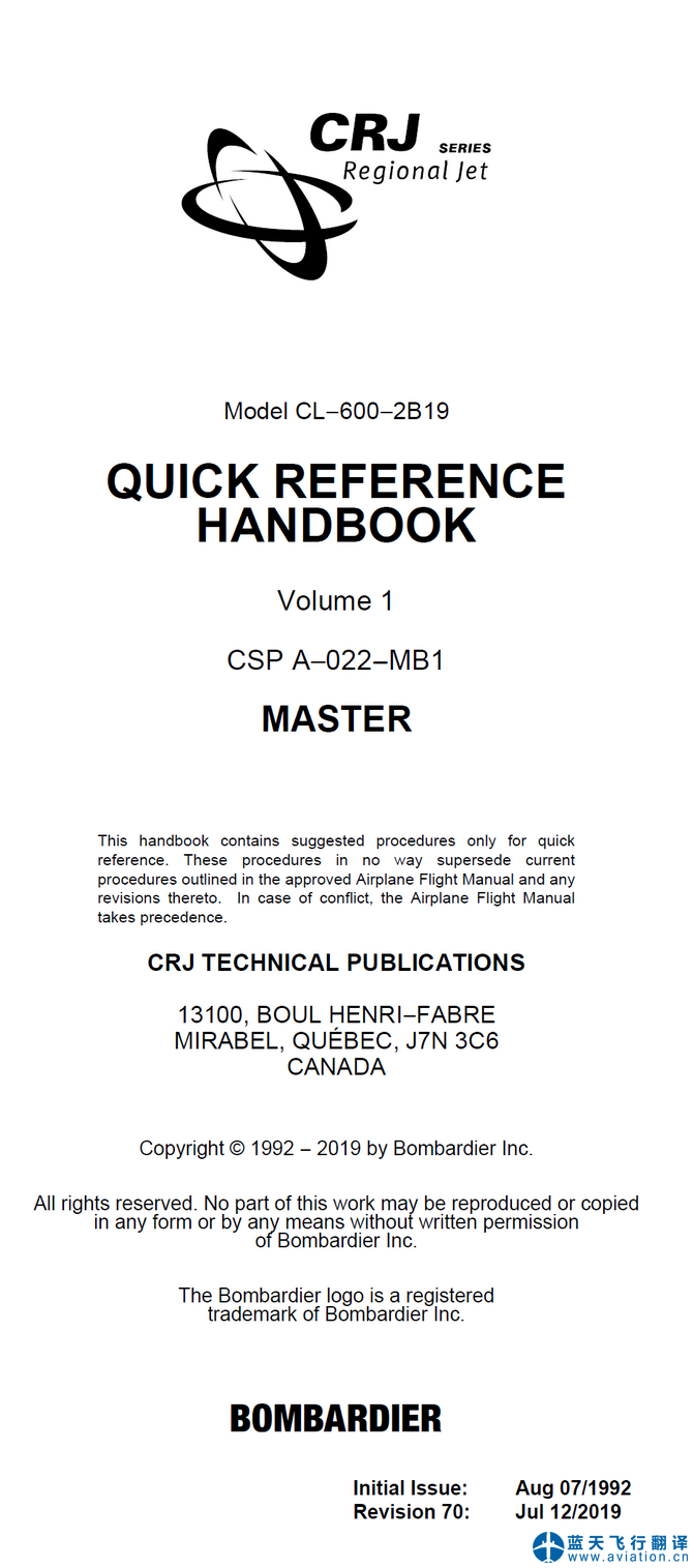 本次翻譯的CRJ200快速檢查單為第70版,2019年7月12日版本,分為上下兩冊。Model CL−600−2B19