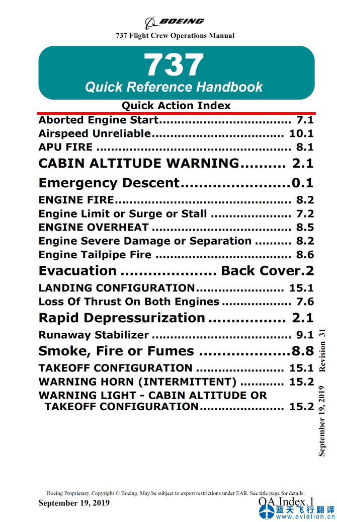 北京藍天飛行翻譯公司完成大型航空公司2019年9月19日版本波音737-800快速檢查單翻譯任務 September 19, 2019 Revision 31 737-800 Quick Reference Handbook (QRH) Translation
