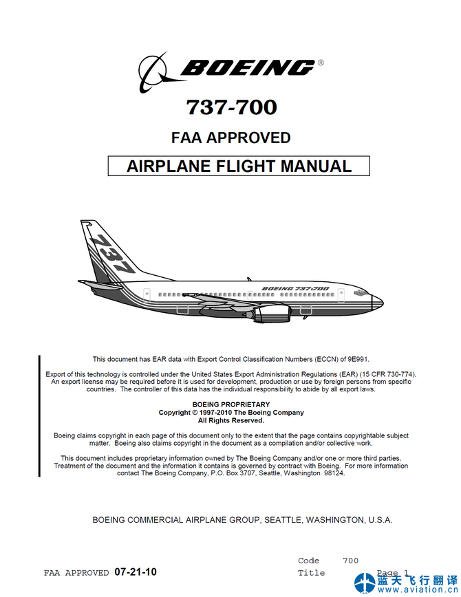 北京藍(lán)天飛行翻譯公司承接航空公司波音737-700飛機(jī)飛行手冊(cè)翻譯任務(wù) 08-05-19 737-700 Airplane Flight Manual Translation